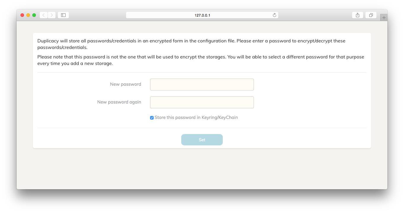 The first thing you need to do after you start Duplicacy Web Edition for the first time, is to choose a master password. As the following page indicates, this master password is used to encrypt all storage-related credentials which can then be stored safely in a configuration file. Duplicacy Web Edition will store the secure token derived from this password, instead of the password in plaintext, in the OS-specific password storage such as Keychain or Keyring. If such a password storage isn't available, Duplicacy Web Edition will ask you to enter this password on every restart.